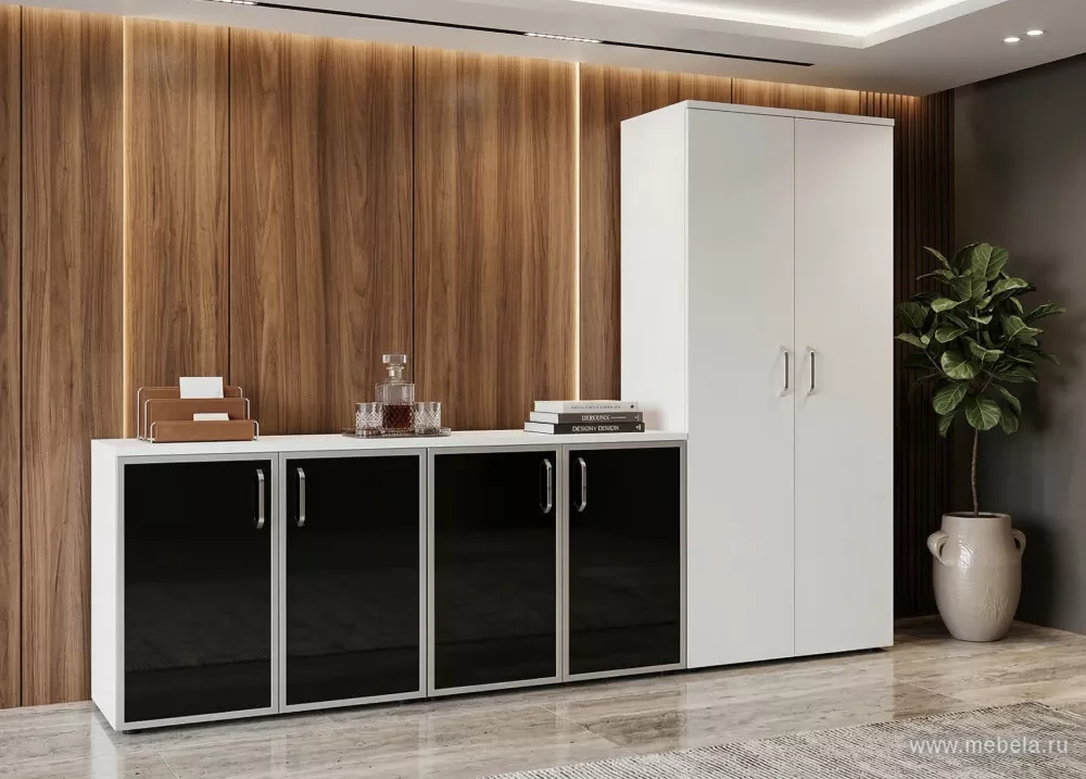 Офисный шкаф низкий широкий с чёрным стеклом в раме