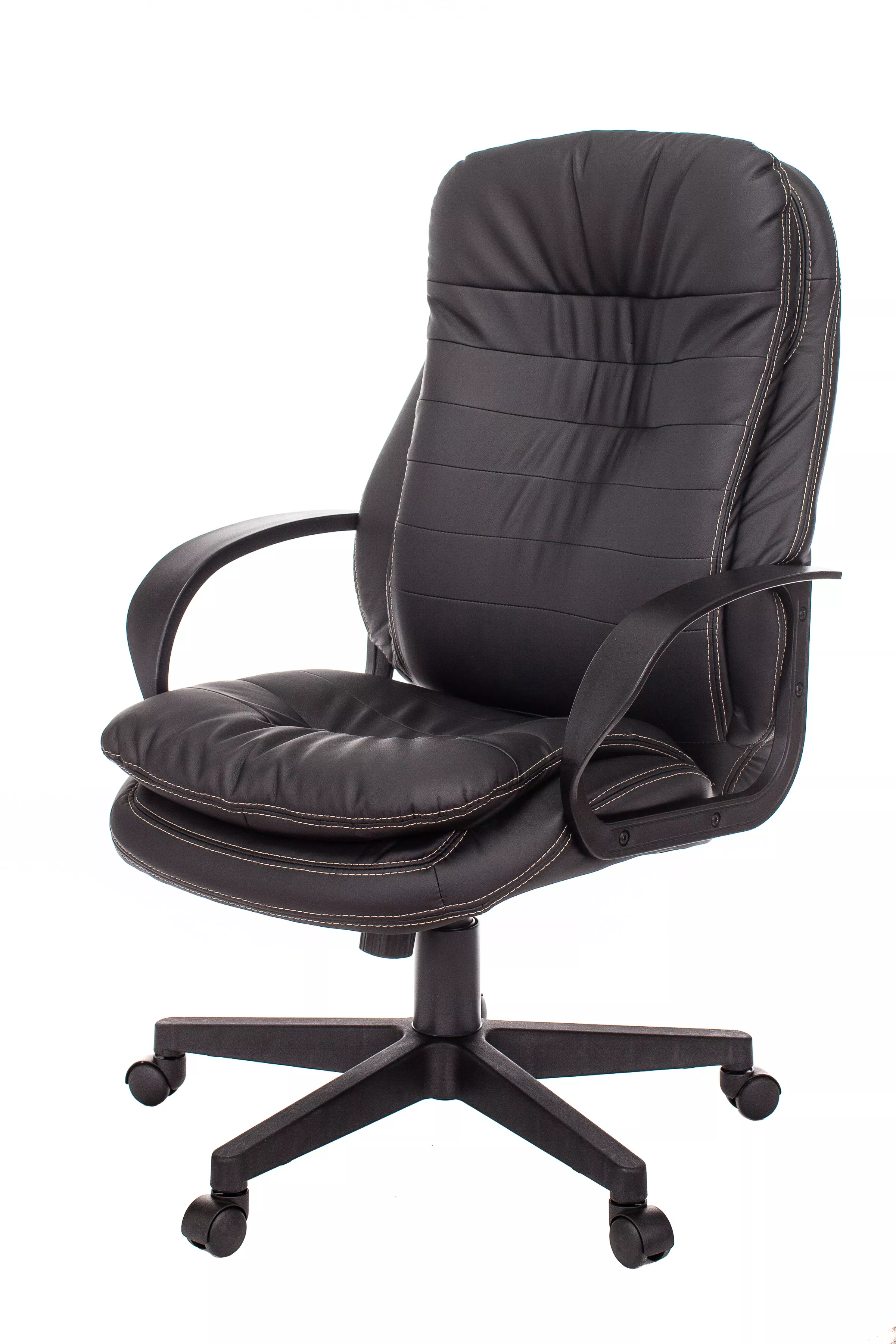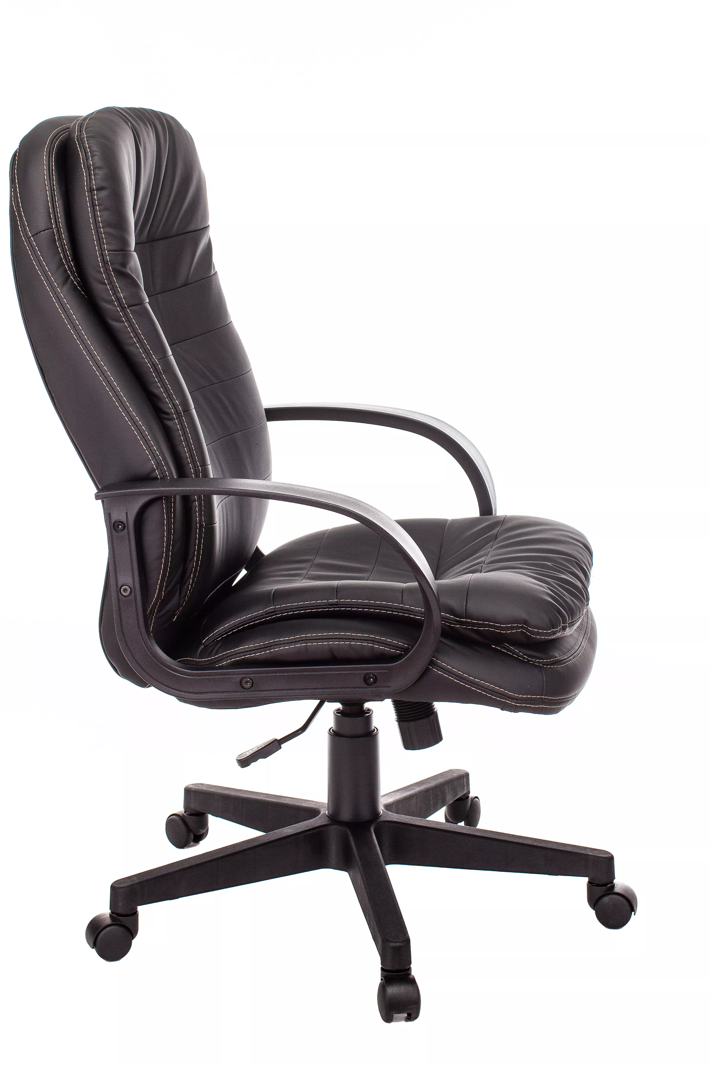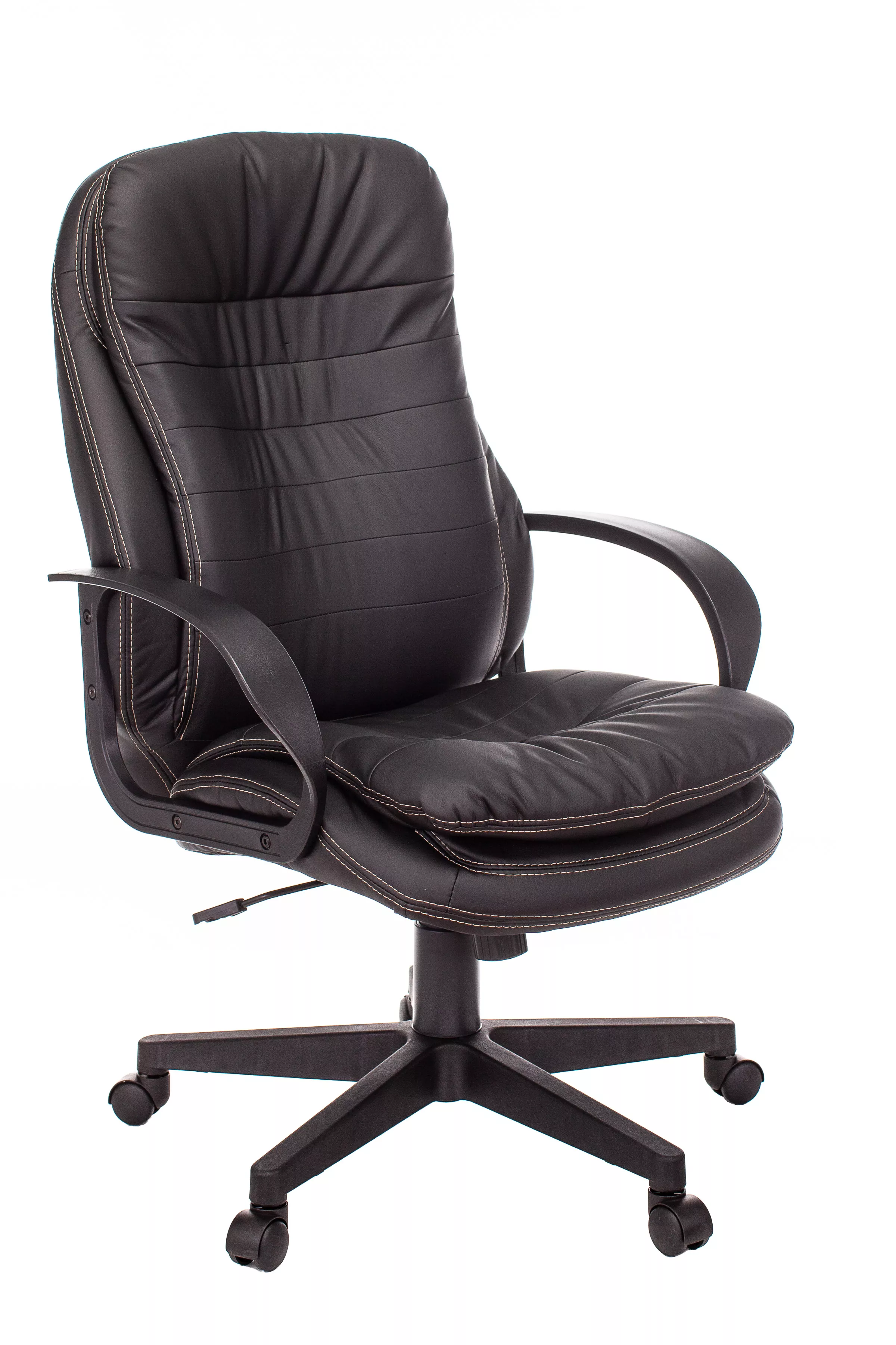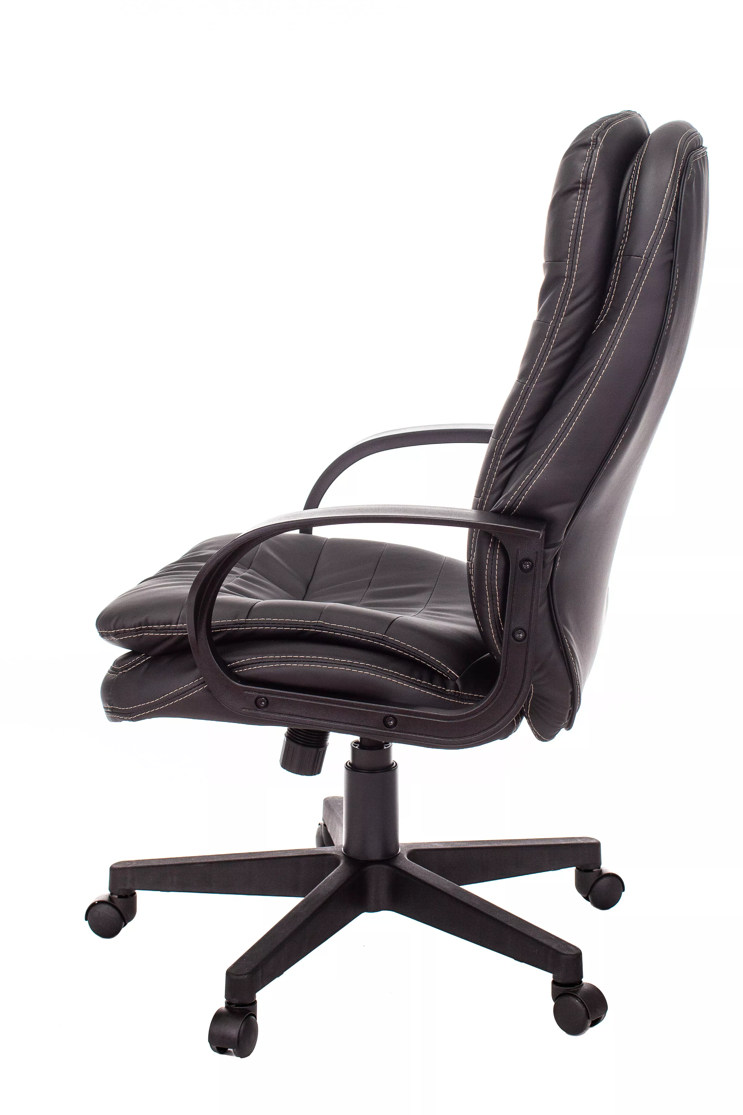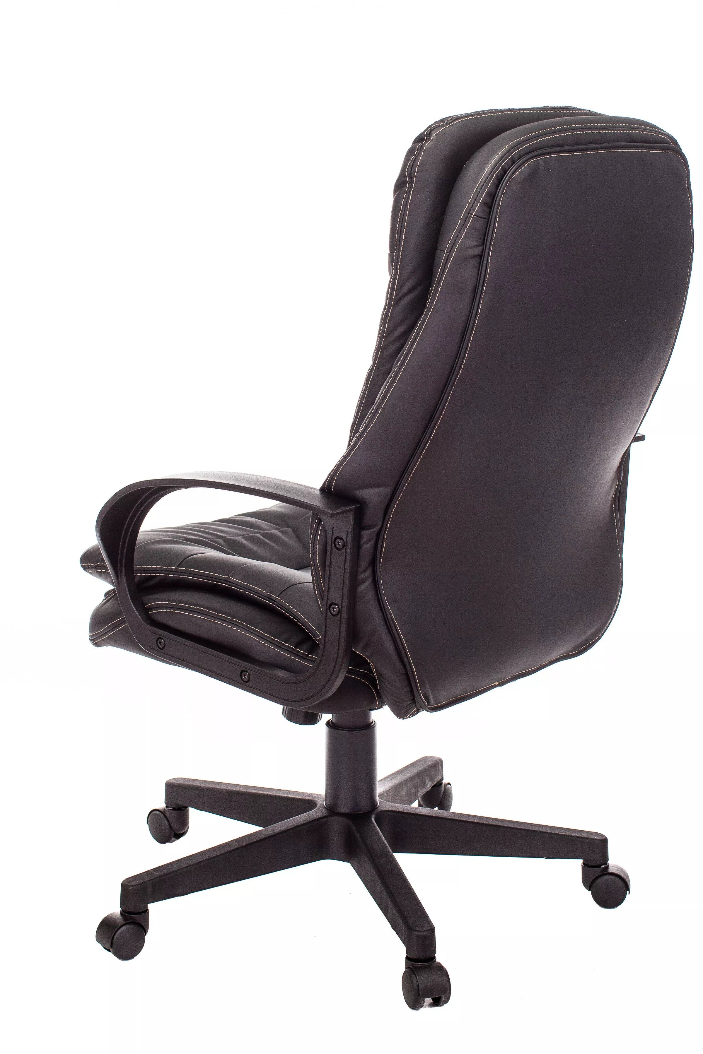 Обивка кресла выполнена из высококачественной экокожи черного цвета, которая не только стильно смотрится, но и легко чистится. Спинка кресла отделена от сиденья, что позволяет обеспечить лучшую вентиляцию и комфорт при длительном сидении. Высота кресла варьируется от 1065 мм до 765 мм с подлокотниками, а высота сиденья составляет 495 мм. Ширина сиденья — 565 мм, а глубина — 460 мм, что обеспечивает достаточное пространство для комфортного размещения.