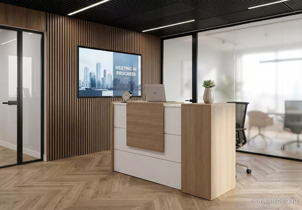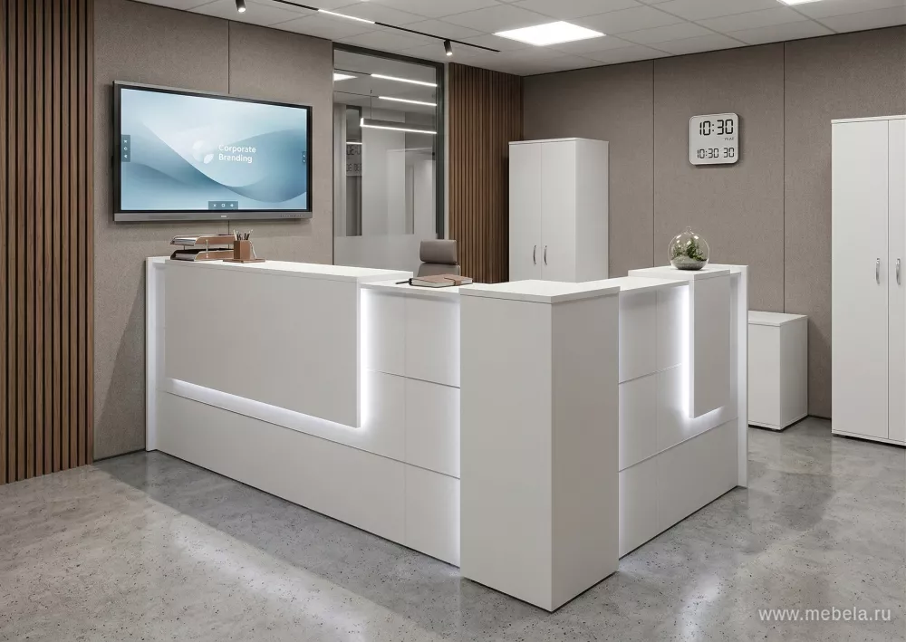 Стойка ресепшн Onix выполнена в эргономичном и современном стиле. Оригинальные геометрические модули и возможность объединения нескольких контрастных декоров придают стойке визуальную легкость и стиль. Модные цвета древесного декорирования в сочетании с белым цветом опор столешницы и топа освежают интерьер.